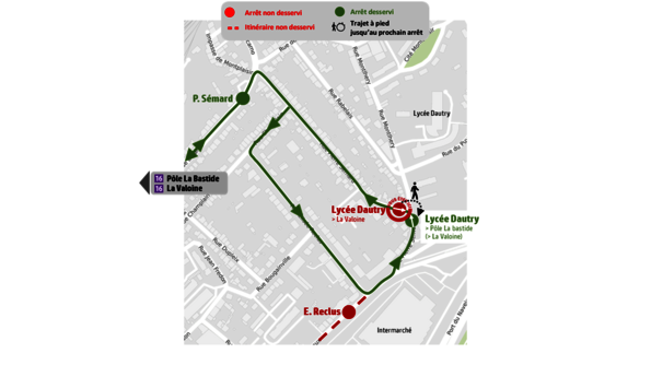 En raison de travaux RCU av. des Casseaux qui auront lieu du lundi 5 janvier jusqu’à nouvel ordre, la ligne 16 Pôle La Bastide <> La Valoine aura son itinéraire modifié dans les 2 sens de circulation.
