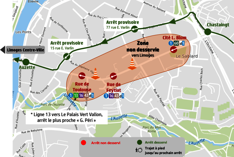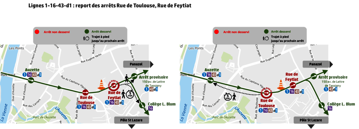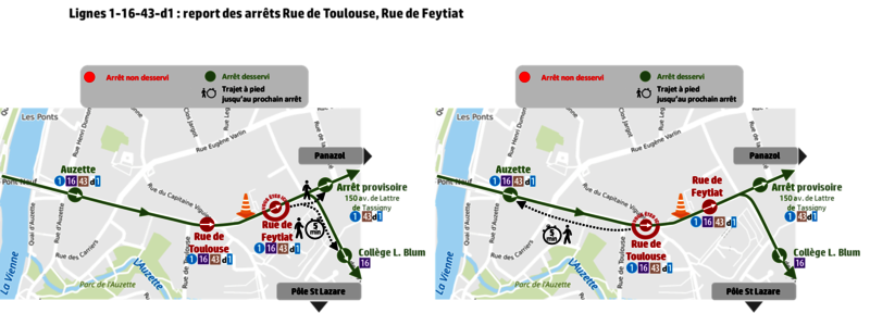 Secteur av. Mal de Lattre de Tassigny Du lundi 13 octobre jusqu'à nouvel ordre Actualisé à 16h En raison de l'évolution des travaux av. Mal de Lattre de Tassigny, l'exploitation des lignes 1, 13, 16, 43,60 et d1 est modifiée du 13 octobre jusqu'à nouvel ordre, selon les nouvelles modalités ci-dessous : Vers Centre-Ville Vers Panazol, La Valoine Vers Le Palais Vert Vallon et Feytiat Plein Bois