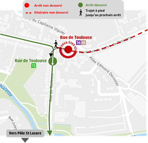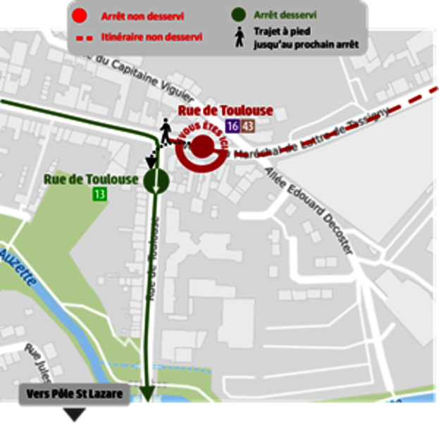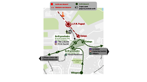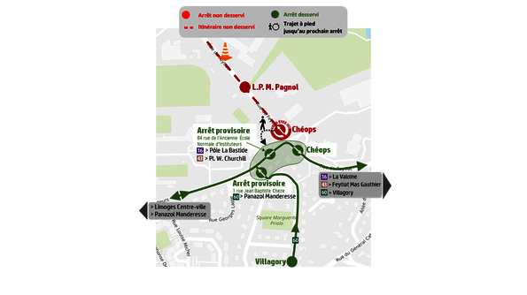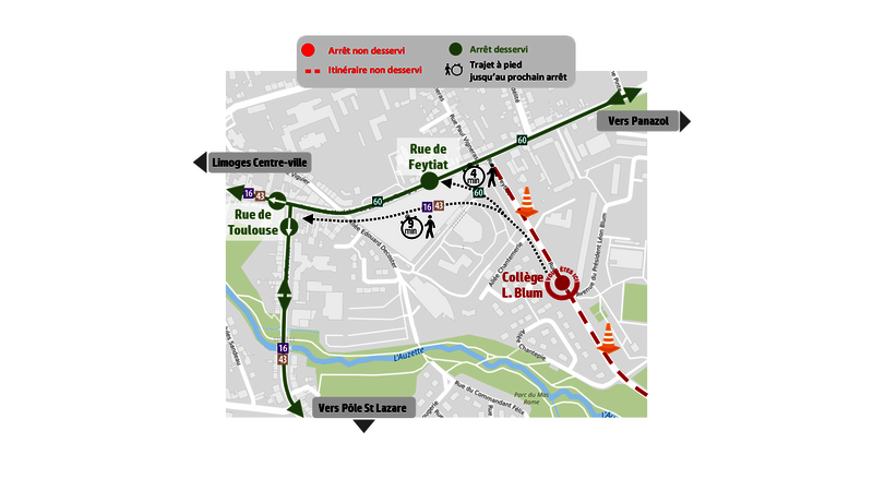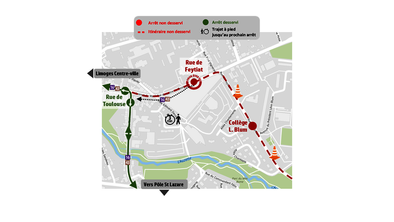Par conséquent, les arrêts “Rue de Toulouse” (L.16 - 43 vers La Valoine), “Rue de Feytiat”, « Collège L. Blum », « L.P. M. Pagnol » dans les 2 sens et « Chéops » vers Limoges Centre-ville/Panazol Manderesse ne seront pas desservis.