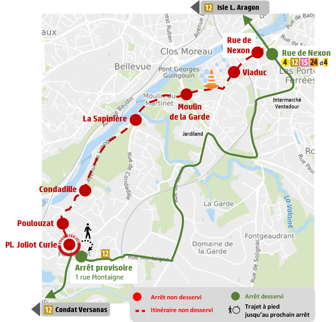 En conséquence les arrêts : « Pl. Joliot Curie », « Poulouzat », « Condadille », « La Sapinière », « Moulin de la Garde », « Viaduc » et « Rue de Nexon » ne seront pas desservis.