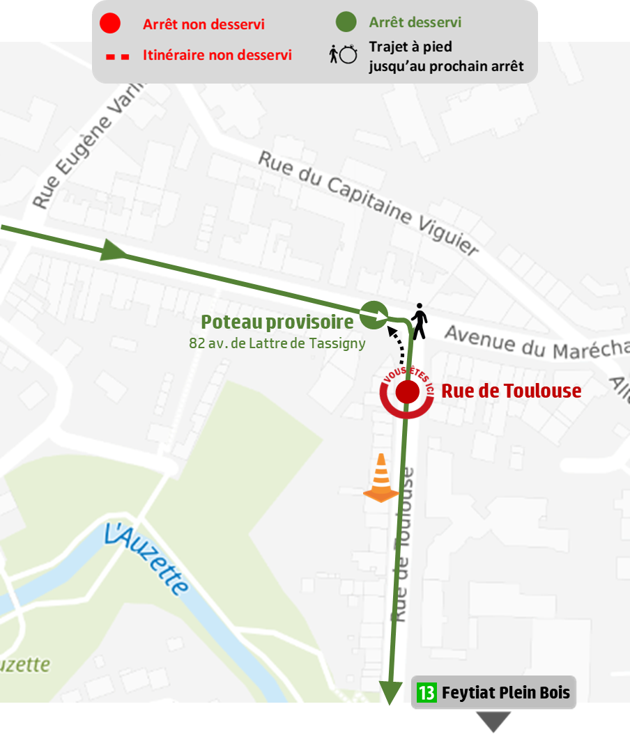 Par conséquent, l’arrêt « Rue de Toulouse » vers Feytiat Plein Bois est reporté sur un poteau provisoire situé 82 av. de Lattre de Tassigny (voir plan ci-dessous)